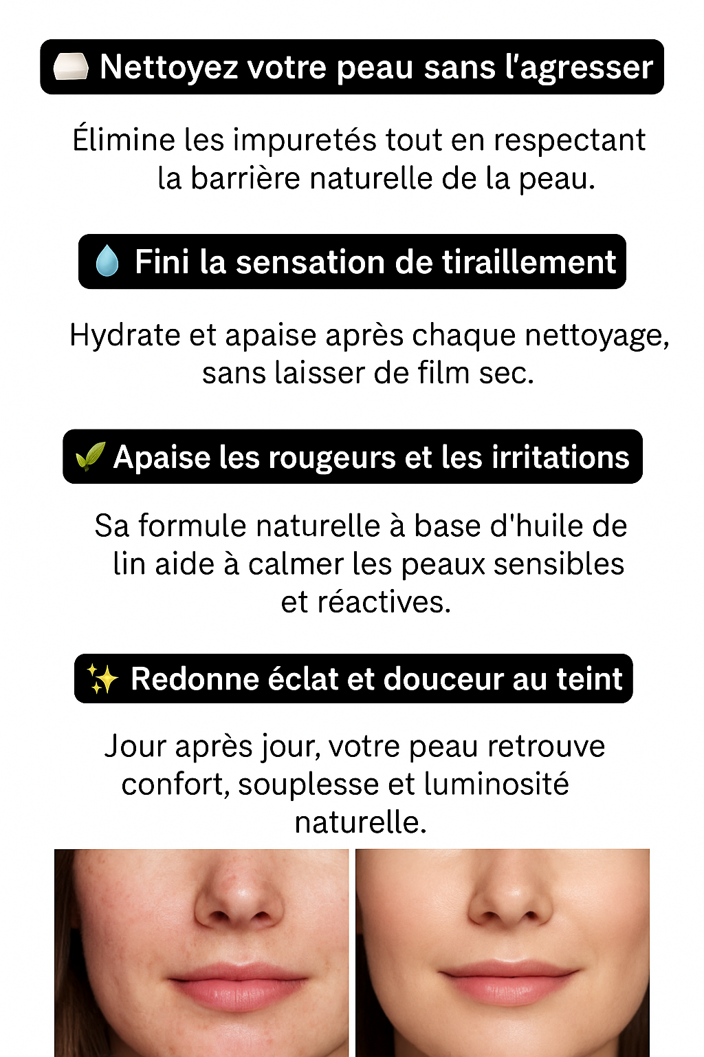 Grâce à 20 % d’huile de lin riche en oméga-3, ce savon-soin révèle jour après jour un teint plus uniforme et une peau apaisée, douce et lumineuse dès les premières utilisations.